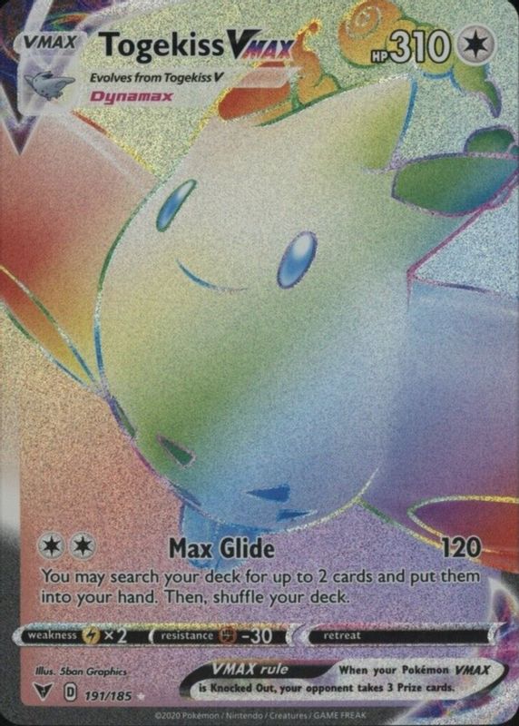 The Togekiss VMAX 2020 Sword & Shield: Vivid Voltage #191/185 Holo (Secret) card in Raw TCG (Near Mint) condition has moved up $1.38 (+11.5%) in the last 30 days and was last sold for $13.37 .