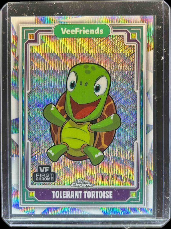 The Tolerant Tortoise 2025 Topps Chrome VeeFriends #93 Wave Refractor /150 card is 1 of 27 Tolerant Tortoise's card variations in the 2025 Topps Chrome VeeFriends set being tracked by Sports Card Investor, including Base, Refractor, Yellow Refractor, Shimmer Refractor /250, and RayWave Refractor /199.