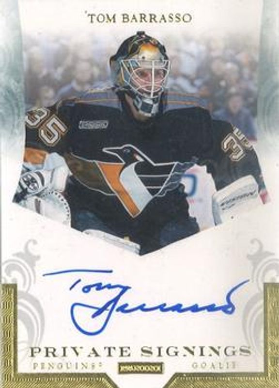The Tom Barrasso 2012 Limited #TB2 Private Signings card is 1 of 2 Tom Barrasso's card variations in the 2012 Limited set being tracked by Sports Card Investor, including Private Signings - Platinum /1.