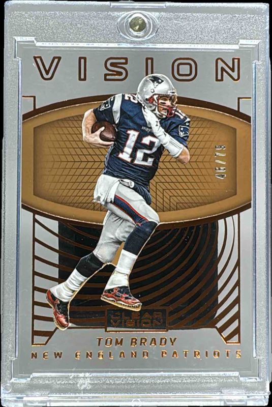 The Tom Brady 2016 Clear Vision #12 Vision - Bronze /79 card is 1 of 21 Tom Brady's card variations in the 2016 Clear Vision set being tracked by Sports Card Investor, including Base /999, Blue /99, Bronze /79, Red /49, and Gold /29.