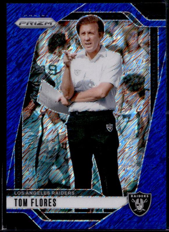 The Tom Flores 2024 Prizm #156 Blue Shimmer /25 card is 1 of 83 Tom Flores' card variations in the 2024 Prizm set being tracked by Sports Card Investor, including Base, Choice Blue Yellow Green, Choice Silver, Disco, and Green.