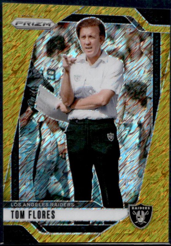 The Tom Flores 2024 Prizm #156 Gold Shimmer /10 card is 1 of 83 Tom Flores' card variations in the 2024 Prizm set being tracked by Sports Card Investor, including Base, Choice Blue Yellow Green, Choice Silver, Disco, and Green.
