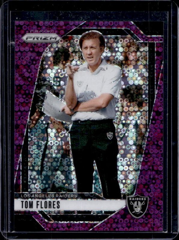 The Tom Flores 2024 Prizm #156 No Huddle Purple /49 card is 1 of 83 Tom Flores' card variations in the 2024 Prizm set being tracked by Sports Card Investor, including Base, Choice Blue Yellow Green, Choice Silver, Disco, and Green.