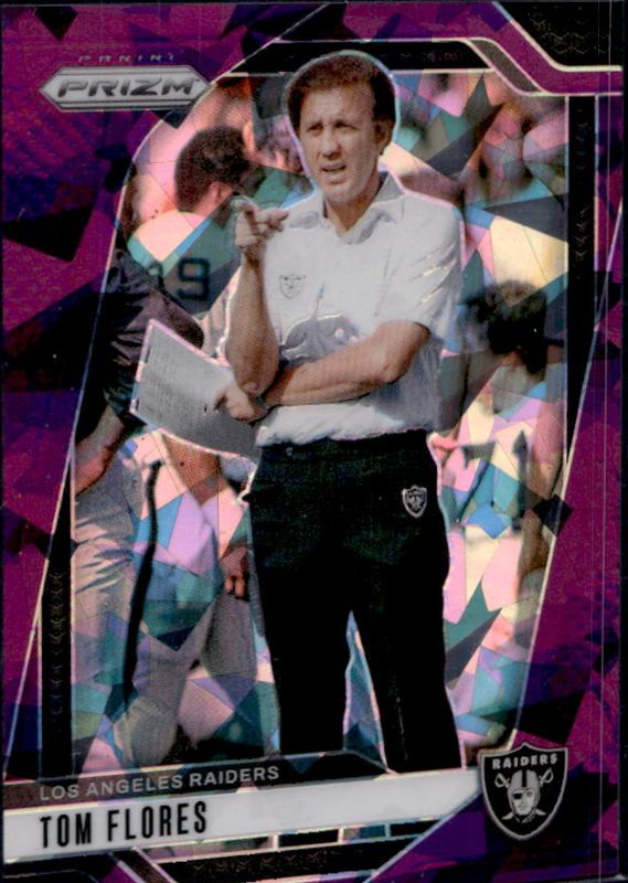 The Tom Flores 2024 Prizm #156 Purple Ice /225 card is 1 of 83 Tom Flores' card variations in the 2024 Prizm set being tracked by Sports Card Investor, including Base, Choice Blue Yellow Green, Choice Silver, Disco, and Green.