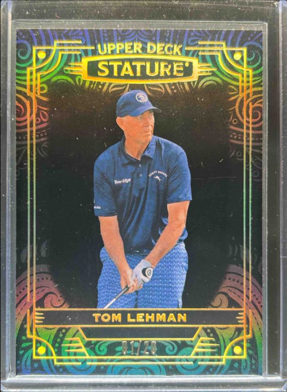 The Tom Lehman 2024 Upper Deck Portfolio #21 Stature Black Parallel /20 card is 1 of 40 Tom Lehman's card variations in the 2024 Upper Deck Portfolio set being tracked by Sports Card Investor, including Base, Color Portraits, Wire Photos, Allure, and Allure Black Rainbow Parallel.