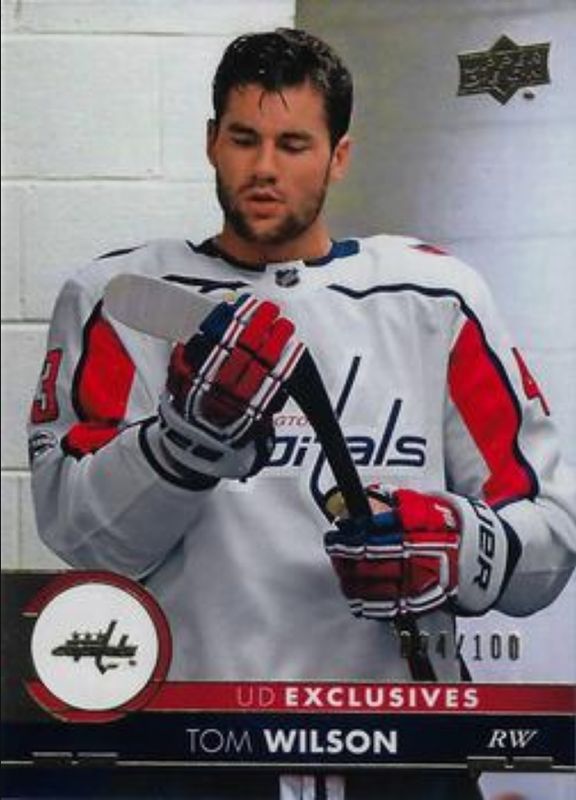 The Tom Wilson 2017 Upper Deck #440 UD Exclusives /100 card is 1 of 12 Tom Wilson's card variations in the 2017 Upper Deck set being tracked by Sports Card Investor, including Base, Clear Cut, Gold Rainbow Foil, Silver Foil, and UD Midnight /25.