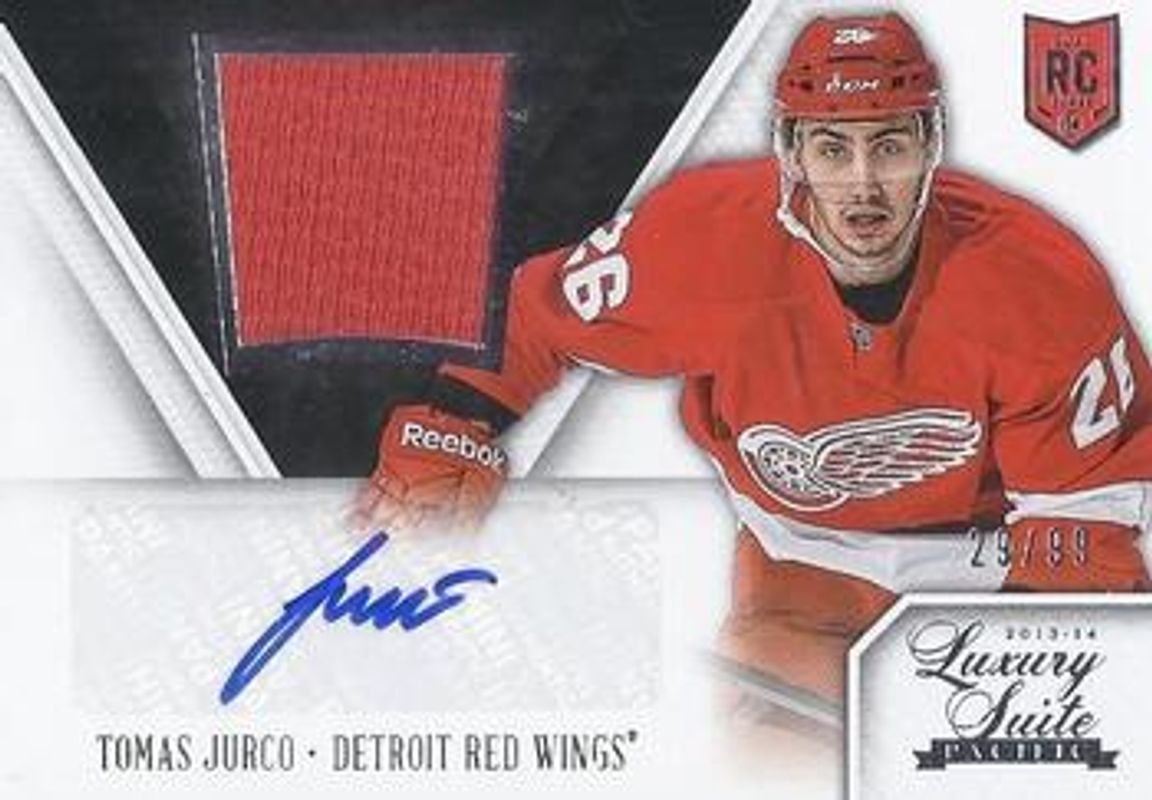 The Tomas Jurco 2013 Panini Rookie Anthology #189 Luxury Suite Rookie Autographs /99 card is 1 of 51 Tomas Jurco's card variations in the 2013 Panini Rookie Anthology set being tracked by Sports Card Investor, including Purple /1, 2013 Panini Update, 2013 Panini Update:, 2013 Panini Update: Rookie Autographs, and 2013 Panini Update: Rookie Autographs Spring Expo Cracked Ice - Black.