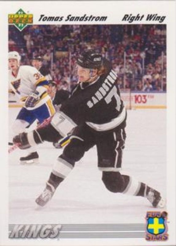 The Tomas Sandstrom 1991 Upper Deck #E7a Euro Stars card is 1 of 8 Tomas Sandstrom's card variations in the 1991 Upper Deck set being tracked by Sports Card Investor, including #141 Base, #30 Base, #30b Base, #85 Base, and #85b Base.