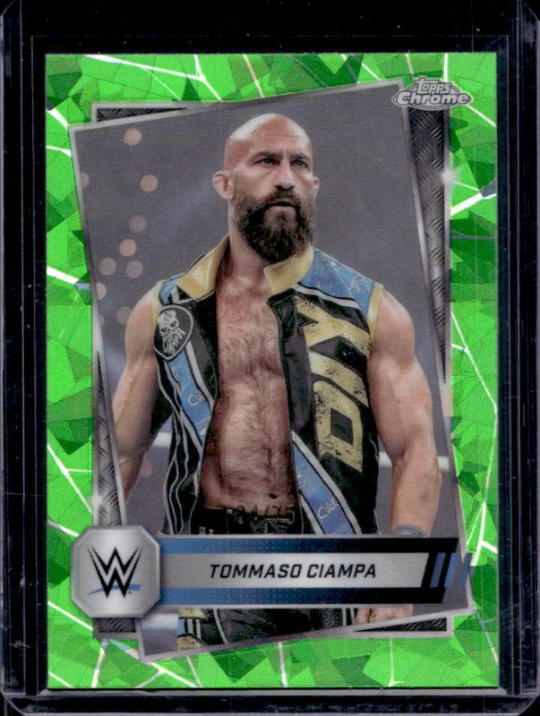 The Tommaso Ciampa 2025 Topps Chrome WWE Sapphire Edition #197 Base Chrome - Green Refractor /75 card is 1 of 11 Tommaso Ciampa's card variations in the 2025 Topps Chrome WWE Sapphire Edition set being tracked by Sports Card Investor, including Base Chrome, Blue Brand Autographs, Base Chrome - Gold Refractor /50, Base Chrome - Orange Refractor /25, and Blue Brand Autographs - Orange Refractor /25.