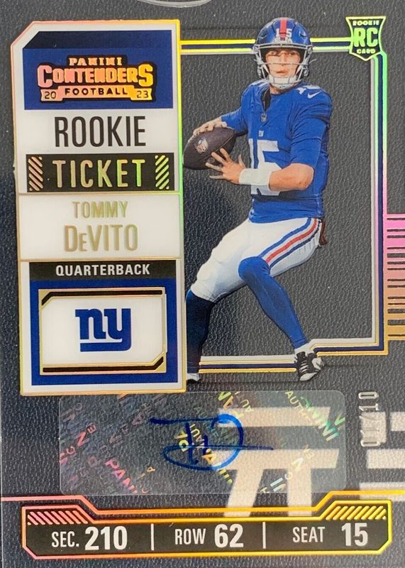 The Tommy DeVito 2023 Contenders #221 Rookie Ticket Auto - Clear Ticket /10 card in Raw condition has not changed in price in the last 30 days and was last sold for $46.00 .