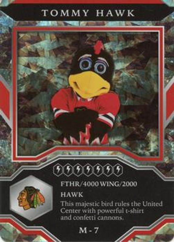 The Tommy Hawk 2021 Upper Deck MVP #M-7 Mascots Gaming Sparkle card is 1 of 6 Tommy Hawk's card variations in the 2021 Upper Deck MVP set being tracked by Sports Card Investor, including Mascots Gaming, Mascot Gaming - Printing Plates Black /1, Mascot Gaming - Printing Plates Cyan /1, Mascot Gaming - Printing Plates Magenta /1, and Mascot Gaming - Printing Plates Yellow /1.