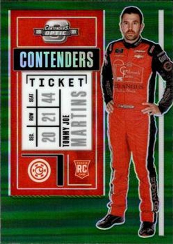 The Tommy Joe Martins 2021 Chronicles NASCAR #14 Contenders Optic - Green Rookie card is 1 of 58 Tommy Joe Martins' card variations in the 2021 Chronicles NASCAR set being tracked by Sports Card Investor, including Base, Blue /199, Red /99, Purple /25, and Gold /10.