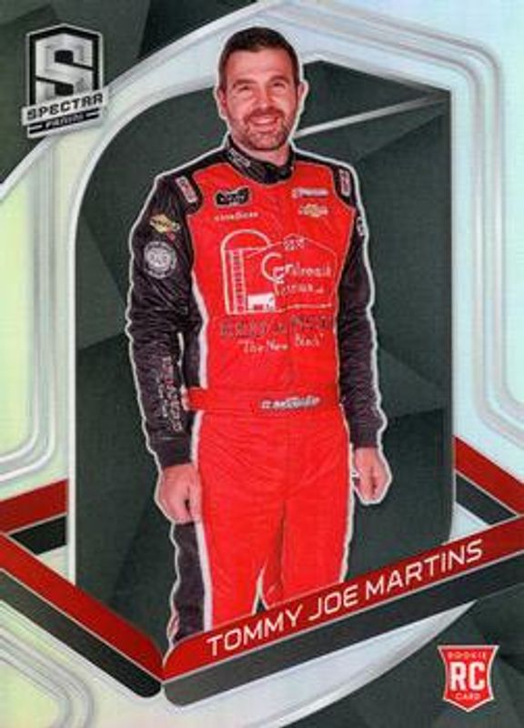 The Tommy Joe Martins 2021 Chronicles NASCAR #21 Spectra Rookie card is 1 of 58 Tommy Joe Martins' card variations in the 2021 Chronicles NASCAR set being tracked by Sports Card Investor, including Base, Blue /199, Red /99, Purple /25, and Gold /10.