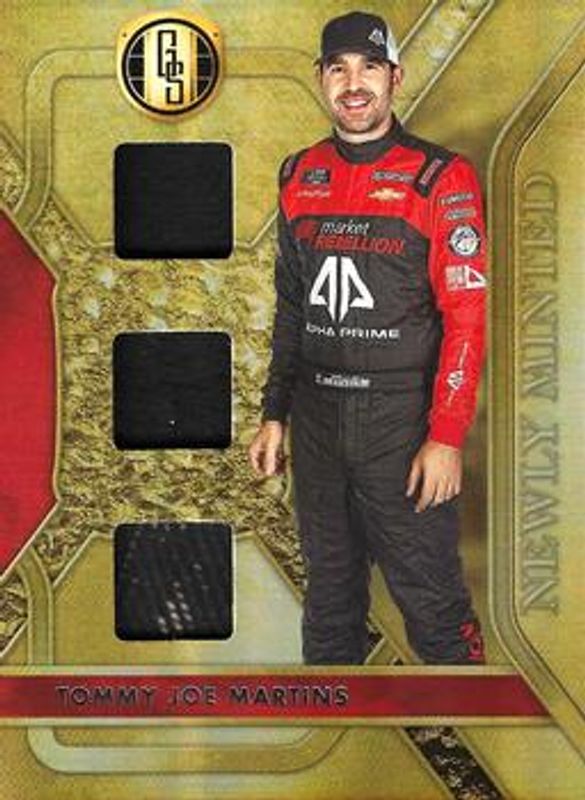 The Tommy Joe Martins 2023 Chronicles NASCAR #GS-TM Gold Standard Newly Minted Memorabilia card is 1 of 35 Tommy Joe Martins' card variations in the 2023 Chronicles NASCAR set being tracked by Sports Card Investor, including Obsidian Signatures, Score, Score Autographs, Score - Blue /199, and Immaculate /99.
