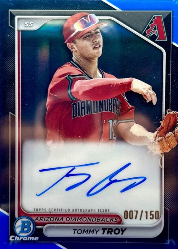 The Tommy Troy 2024 Bowman #CPA-TT Chrome Prospect Auto - Blue Refractor /150 card in Raw condition has not changed in price in the last 30 days and was last sold for $15.00 .