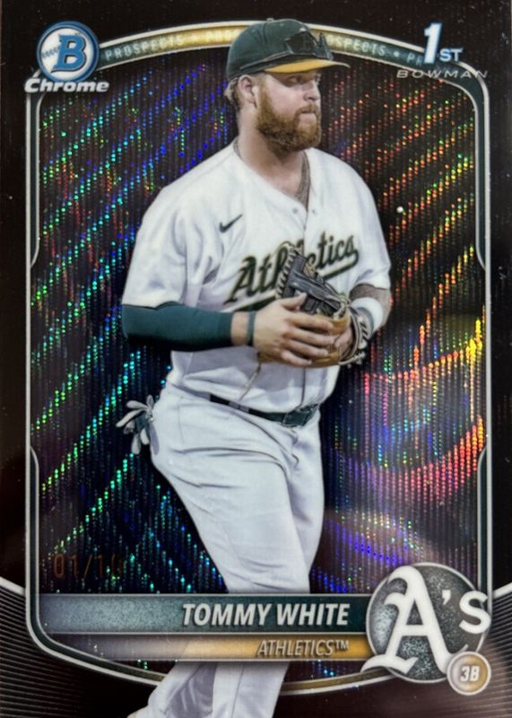 The Tommy White 2025 Bowman Chrome #BCP-251 Prospects - Black Wave Refractor /10 (1st) card in Raw condition has not changed in price in the last 30 days and was last sold for $175.00 .