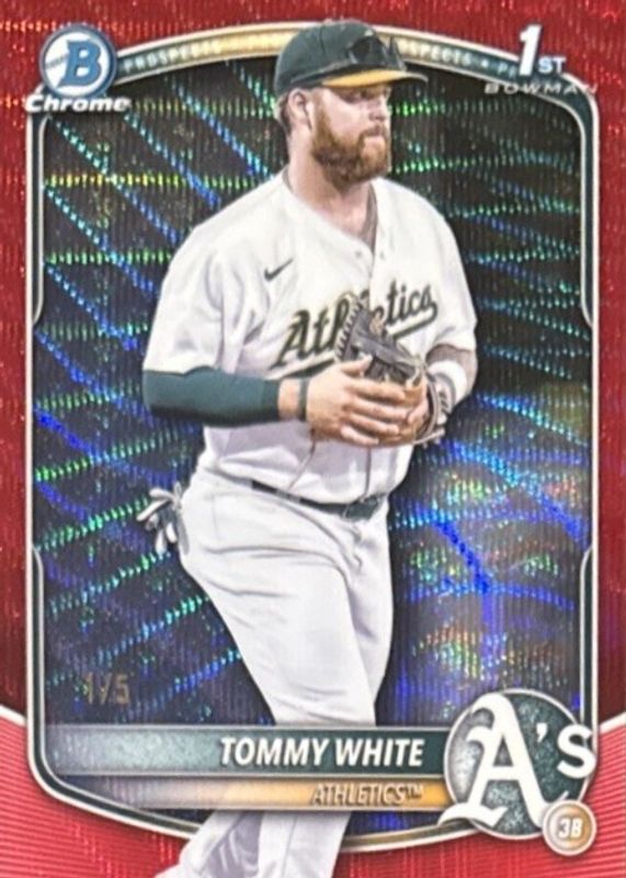 The Tommy White 2025 Bowman Chrome #BCP-251 Prospects - Red Wave Refractor /5 (1st) card in Raw condition has not changed in price in the last 30 days and was last sold for $179.50 .