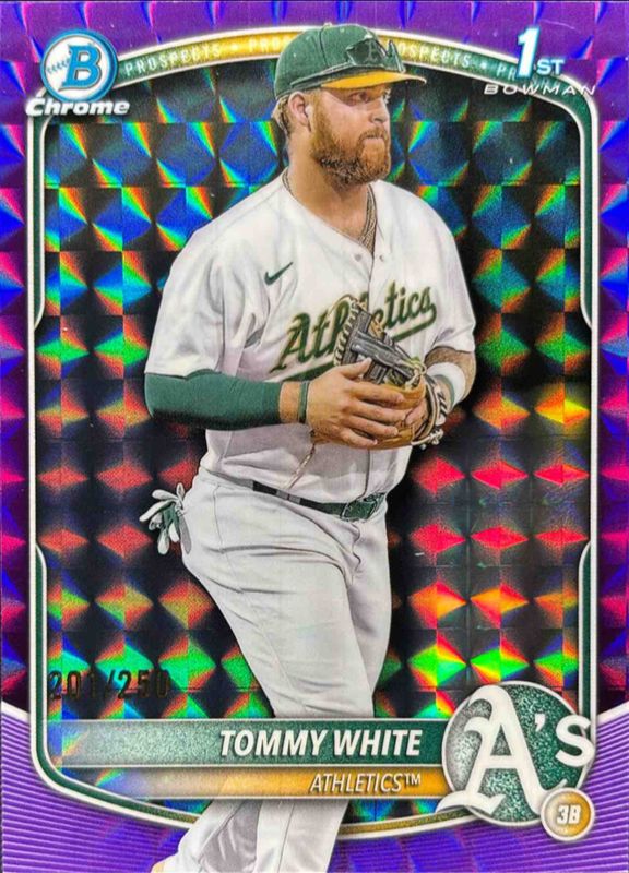 The Tommy White 2025 Bowman Chrome #BCP-251 Prospects - Reptilian Gold Refractor /50 (1st) card in Raw condition has not changed in price in the last 30 days and was last sold for $32.88 .