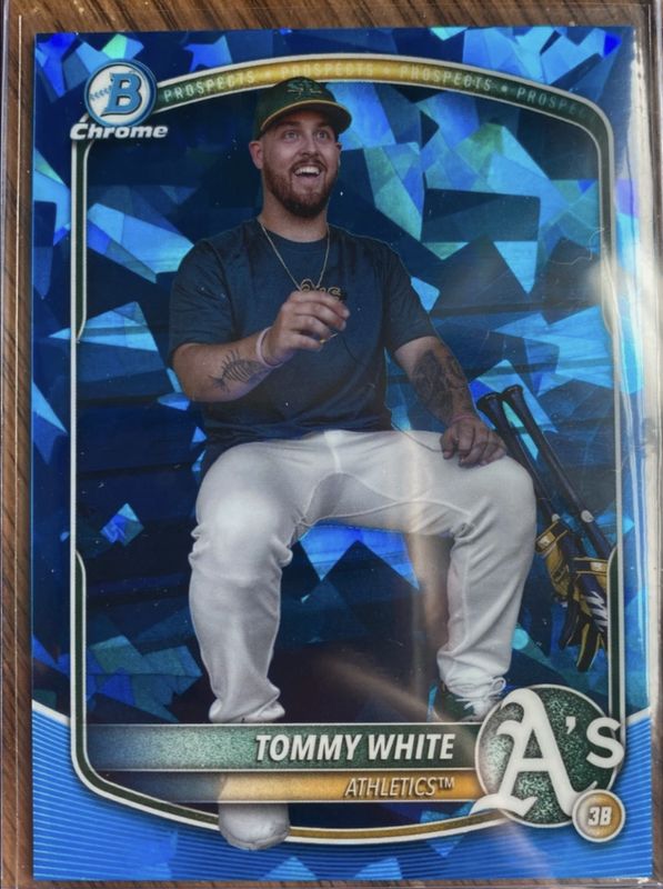 The Tommy White 2025 Bowman Chrome Sapphire Edition #BCP-251 Chrome Prospects Image Variation card is 1 of 17 Tommy White's card variations in the 2025 Bowman Chrome Sapphire Edition set being tracked by Sports Card Investor, including Prospects (1st), Prospects Image Variation, Prospects - Yellow /75 (1st), Prospects - Gold /50 (1st), and Prospects Image Variation - Gold /50.