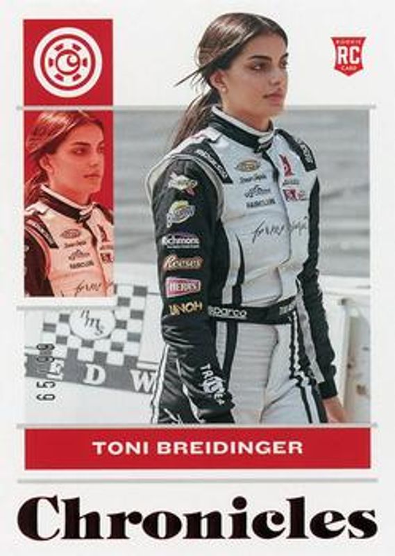 The Toni Breidinger 2022 Chronicles NASCAR #12 Chronicles Red /99 Rookie card is 1 of 49 Toni Breidinger's card variations in the 2022 Chronicles NASCAR set being tracked by Sports Card Investor, including Base, Chronicles Autographs, Chronicles Blue /199, Chronicles Purple /25, and Chronicles Gold /10.