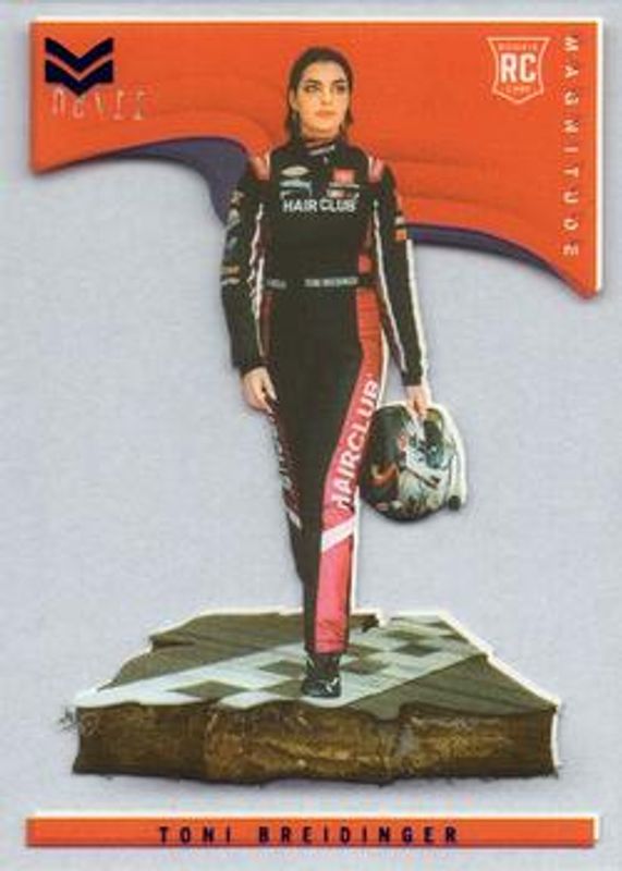 The Toni Breidinger 2022 Chronicles NASCAR #2 Magnitude Blue /50 Rookie card is 1 of 49 Toni Breidinger's card variations in the 2022 Chronicles NASCAR set being tracked by Sports Card Investor, including Base, Chronicles Autographs, Chronicles Blue /199, Chronicles Red /99, and Chronicles Purple /25.