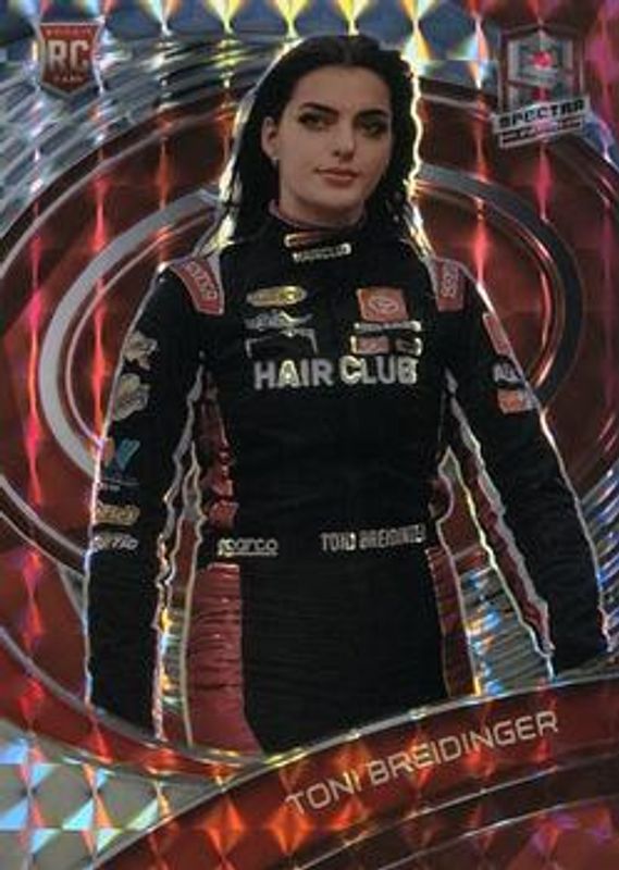 The Toni Breidinger 2022 Chronicles NASCAR #48 Spectra Interstellar Red /49 Rookie card is 1 of 49 Toni Breidinger's card variations in the 2022 Chronicles NASCAR set being tracked by Sports Card Investor, including Base, Chronicles Autographs, Chronicles Blue /199, Chronicles Red /99, and Chronicles Purple /25.