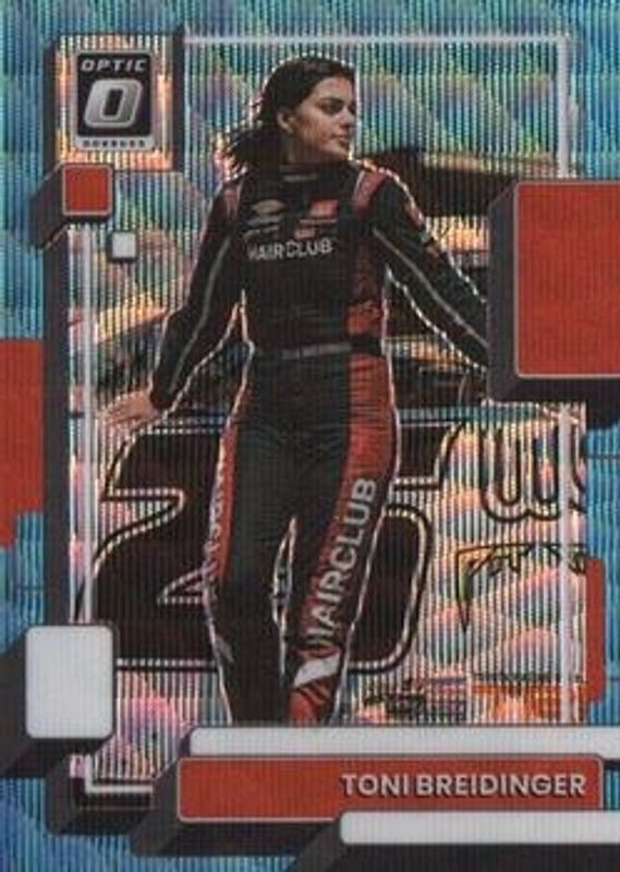 The Toni Breidinger 2023 Donruss NASCAR #54 Optic Carolina Blue Wave card is 1 of 62 Toni Breidinger's card variations in the 2023 Donruss NASCAR set being tracked by Sports Card Investor, including #178 Base, #93 Base, #93 Carolina Blue, #178 Carolina Blue, and #178 Lime Green.