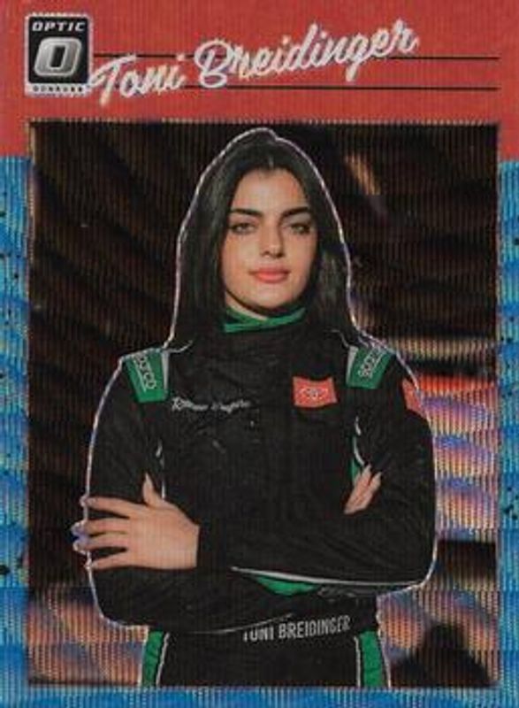 The Toni Breidinger 2023 Donruss NASCAR #99 Optic Carolina Blue Wave card is 1 of 62 Toni Breidinger's card variations in the 2023 Donruss NASCAR set being tracked by Sports Card Investor, including #178 Base, #93 Base, #93 Carolina Blue, #178 Carolina Blue, and #178 Lime Green.