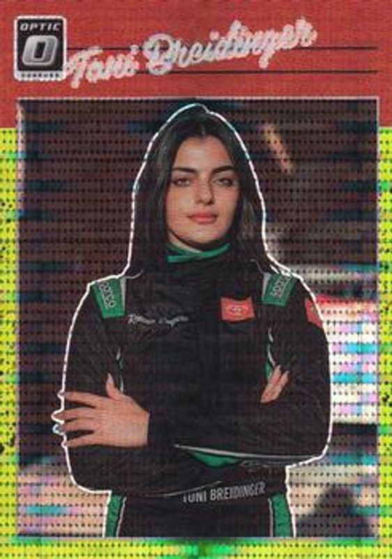 The Toni Breidinger 2023 Donruss NASCAR #99 Optic Lime Green Pulsar card is 1 of 62 Toni Breidinger's card variations in the 2023 Donruss NASCAR set being tracked by Sports Card Investor, including #178 Base, #93 Base, #93 Carolina Blue, #178 Carolina Blue, and #178 Lime Green.