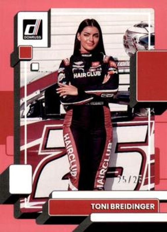 The Toni Breidinger 2023 Donruss NASCAR #93 Pink /25 card is 1 of 62 Toni Breidinger's card variations in the 2023 Donruss NASCAR set being tracked by Sports Card Investor, including #178 Base, #93 Base, #93 Carolina Blue, #178 Carolina Blue, and #178 Lime Green.