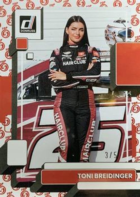 The Toni Breidinger 2023 Donruss NASCAR #93 Top 5 /5 card is 1 of 62 Toni Breidinger's card variations in the 2023 Donruss NASCAR set being tracked by Sports Card Investor, including #178 Base, #93 Base, #93 Carolina Blue, #178 Carolina Blue, and #178 Lime Green.