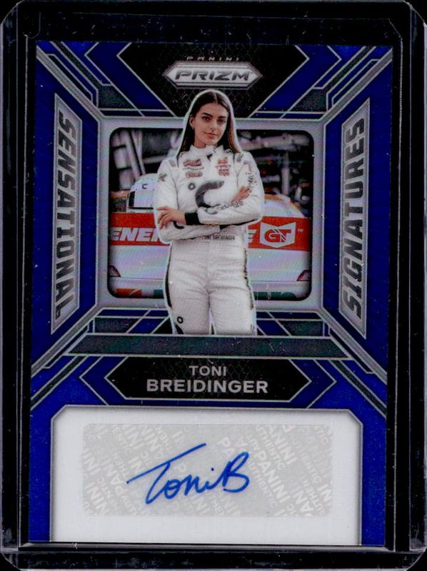 The Toni Breidinger 2024 Prizm NASCAR #SS-TBR Sensational Signatures - Blue /49 card is 1 of 68 Toni Breidinger's card variations in the 2024 Prizm NASCAR set being tracked by Sports Card Investor, including Base, Blue Ice, Green, Green Ice, and Red Ice.