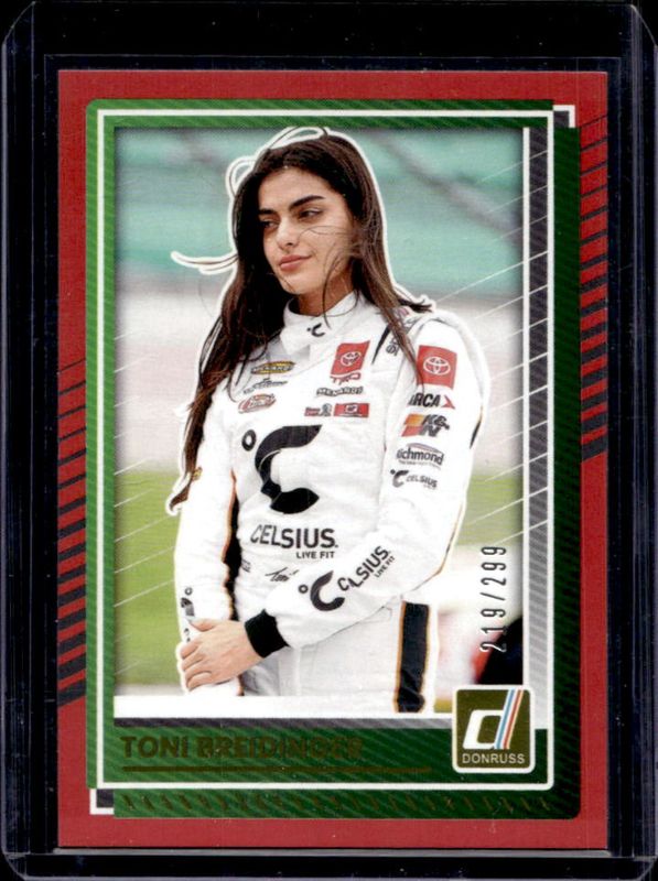 The Toni Breidinger 2025 Donruss NASCAR #37 Red /299 card is 1 of 54 Toni Breidinger's card variations in the 2025 Donruss NASCAR set being tracked by Sports Card Investor, including Base, Laser, Blue /199, Lime Green /199, and Carolina Blue Laser /99.