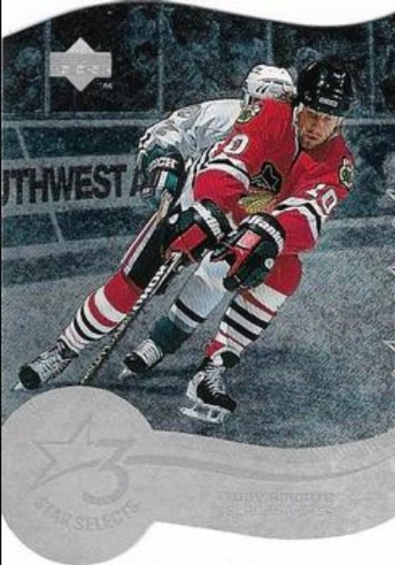 The Tony Amonte 1997 Upper Deck #T9A Three Star Selects card is 1 of 10 Tony Amonte's card variations in the 1997 Upper Deck set being tracked by Sports Card Investor, including #208 Base, #245 Base, #245 Game Dated, #GJ6 Game Jerseys, and #SG10 Smooth Grooves.