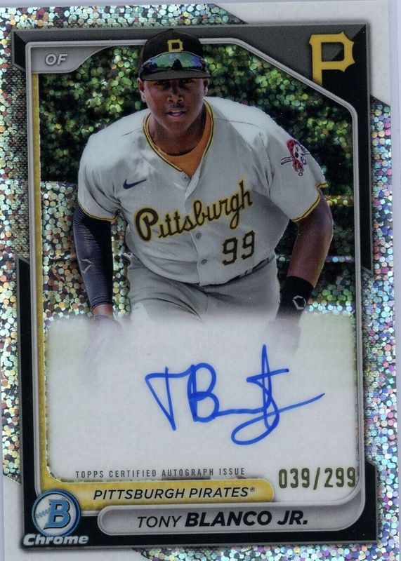 The Tony Blanco Jr. 2024 Bowman #CPA-TB Chrome Prospect Auto - Speckle Refractor /299 card in Raw condition has not changed in price in the last 30 days and was last sold for $64.77 .