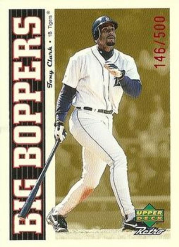 The Tony Clark 1998 Upper Deck Retro #B10 Big Boppers /500 card is 1 of 2 Tony Clark's card variations in the 1998 Upper Deck Retro set being tracked by Sports Card Investor, including Base.