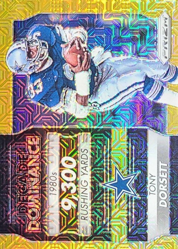 The Tony Dorsett 2016 Prizm #11 Decade of Dominance - Gold Mojo /10 card in Raw condition has not changed in price in the last 30 days and was last sold for $60.00 .