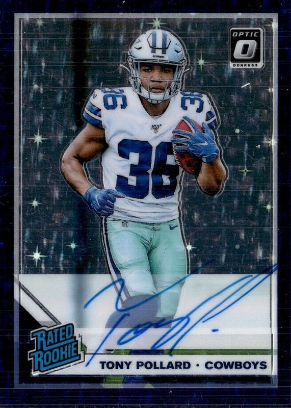 Tony Pollard's Football cards are available in at least 59 sets. Tony Pollard's biggest 7-day price movers are 2019 Optic #187 Rated Rookie Autographs - Purple Stars (/50), 2025 Optic #7 2024 Playoff Contenders Optic Football - Perennial Contender Autographs - Black Scope, and 2025 Optic #7 2024 Playoff Contenders Optic Football - Perennial Contender Autographs.