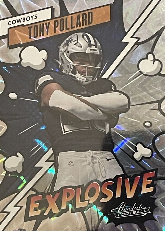 Tony Pollard's Football cards are available in at least 41 sets. Tony Pollard's biggest 7-day price movers are 2023 Absolute #18 Explosive /(SSP), 2019 National Treasures #196 Rookie Patch Auto - Red /1, and 2019 National Treasures #196 Rookie Patch Auto - Platinum NFL Shield /1.