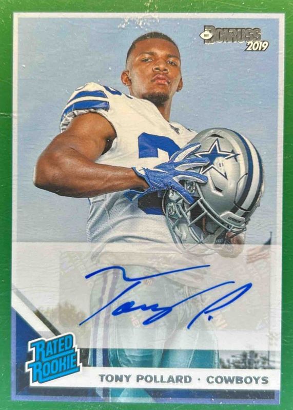 The Tony Pollard 2019 Donruss #337 Rated Rookie Autographs - Green card in Raw condition has not changed in price in the last 30 days and was last sold for $13.62 .