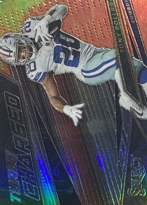 This card is 1 of 6 Tony Pollard's card variations in the 2022 Select set being tracked by Sports Card Investor, including Turbocharged - Zebra /(SSP), Turbocharged - Gold /10, Turbocharged - Green /5, Turbocharged - Green & Black Snakeskin /2, and Turbocharged - Black /1.