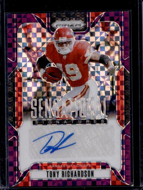 The Tony Richardson 2024 Prizm #SS-TRN Sensational Signatures - Purple Power /49 card is 1 of 21 Tony Richardson's card variations in the 2024 Prizm set being tracked by Sports Card Investor, including Flashback Autographs /149, Franchise Legends /149, Sensational Signatures /149, Flashback Autographs - Blue Ice /99, and Franchise Legends - Blue Ice /99.
