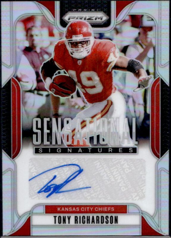 The Tony Richardson 2024 Prizm #SS-TRN Sensational Signatures /149 card is 1 of 21 Tony Richardson's card variations in the 2024 Prizm set being tracked by Sports Card Investor, including Flashback Autographs /149, Franchise Legends /149, Flashback Autographs - Blue Ice /99, Franchise Legends - Blue Ice /99, and Sensational Signatures - Blue Ice /99.