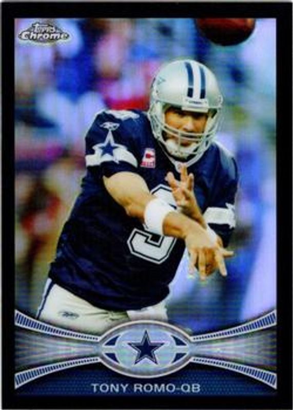 The Tony Romo 2012 Topps Chrome #63 Black Refractor /299 card is 1 of 18 Tony Romo's card variations in the 2012 Topps Chrome set being tracked by Sports Card Investor, including Base, Orange Refractor, Refractor, X-Fractor, and Camo Refractor /499.