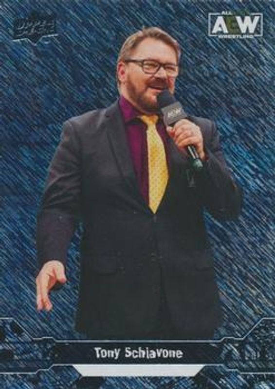The Tony Schiavone 2023 Upper Deck AEW #89 Rampage card is 1 of 19 Tony Schiavone's card variations in the 2023 Upper Deck AEW set being tracked by Sports Card Investor, including Base, Clear Cut, Diamond Plate, Gold, and Pyro.