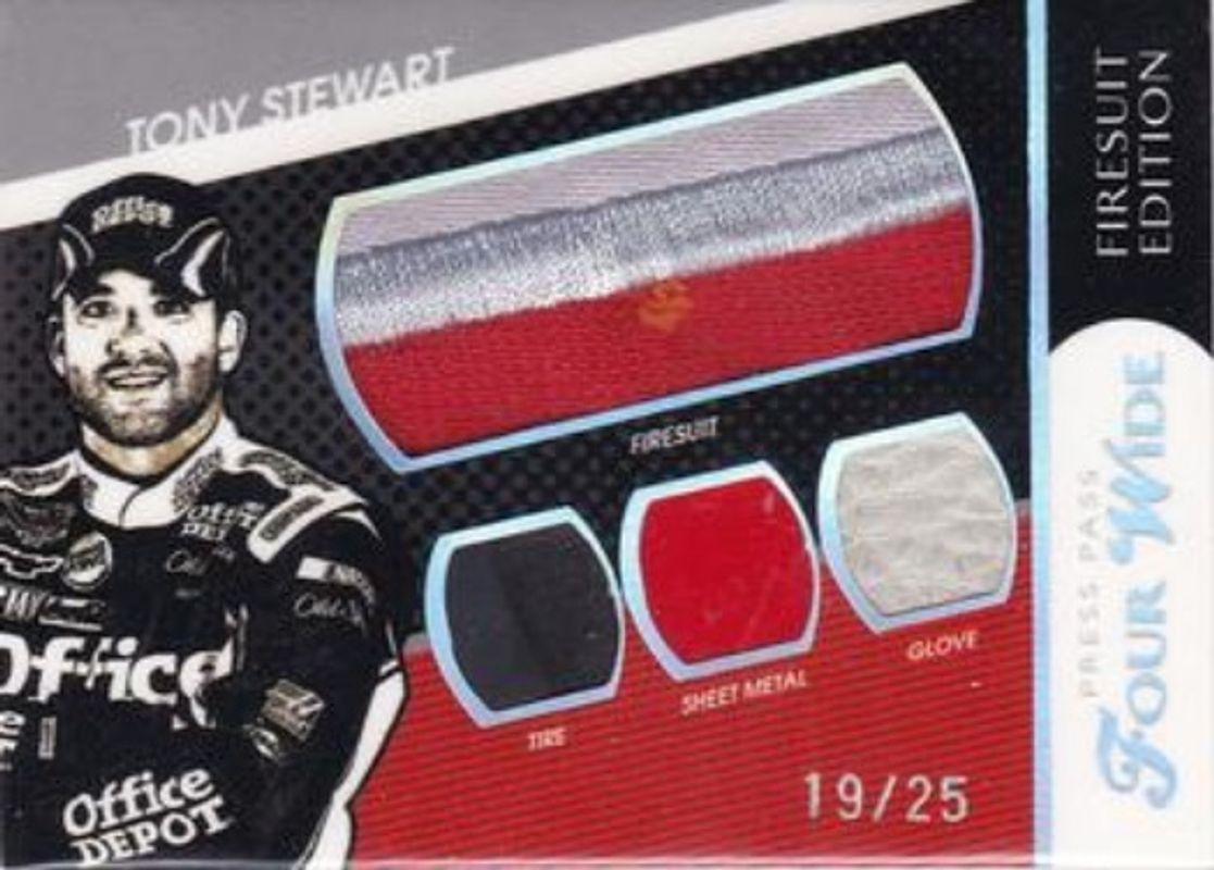 The Tony Stewart 2010 Press Pass Eclipse #FW-TS Four Wide Firesuit Edition /25 card is 1 of 60 Tony Stewart's card variations in the 2010 Press Pass Eclipse set being tracked by Sports Card Investor, including #84 Base, #26 Base, #73 Base, #84 Gallery Edition, and #73 Gallery Edition.