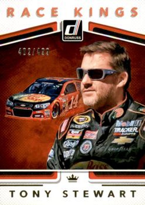 The Tony Stewart 2018 Donruss NASCAR #1 Gold Foil /499 card is 1 of 60 Tony Stewart's card variations in the 2018 Donruss NASCAR set being tracked by Sports Card Investor, including #1 Base, #102b Base, #102a Base, #102b Gold Foil /499, and #102a Gold Foil /499.