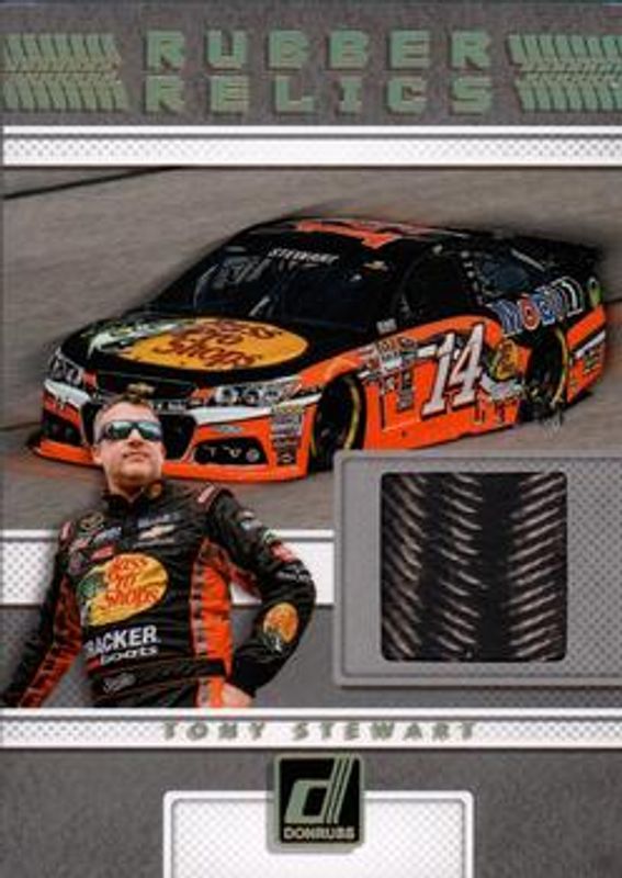 The Tony Stewart 2018 Donruss NASCAR #RR-TS Rubber Relics Holo Gold /99 card is 1 of 60 Tony Stewart's card variations in the 2018 Donruss NASCAR set being tracked by Sports Card Investor, including #1 Base, #102b Base, #102a Base, #1 Gold Foil /499, and #102b Gold Foil /499.