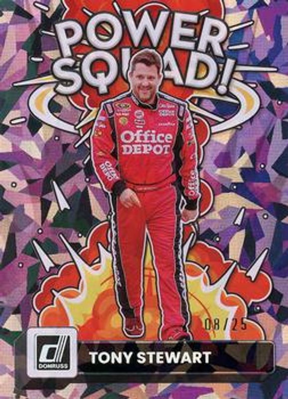 The Tony Stewart 2023 Donruss NASCAR #PS12 Power Squad Cracked Ice /25 card is 1 of 138 Tony Stewart's card variations in the 2023 Donruss NASCAR set being tracked by Sports Card Investor, including #39 Base, #38 Base, #179 Base, #94 Base, and #179 Carolina Blue.