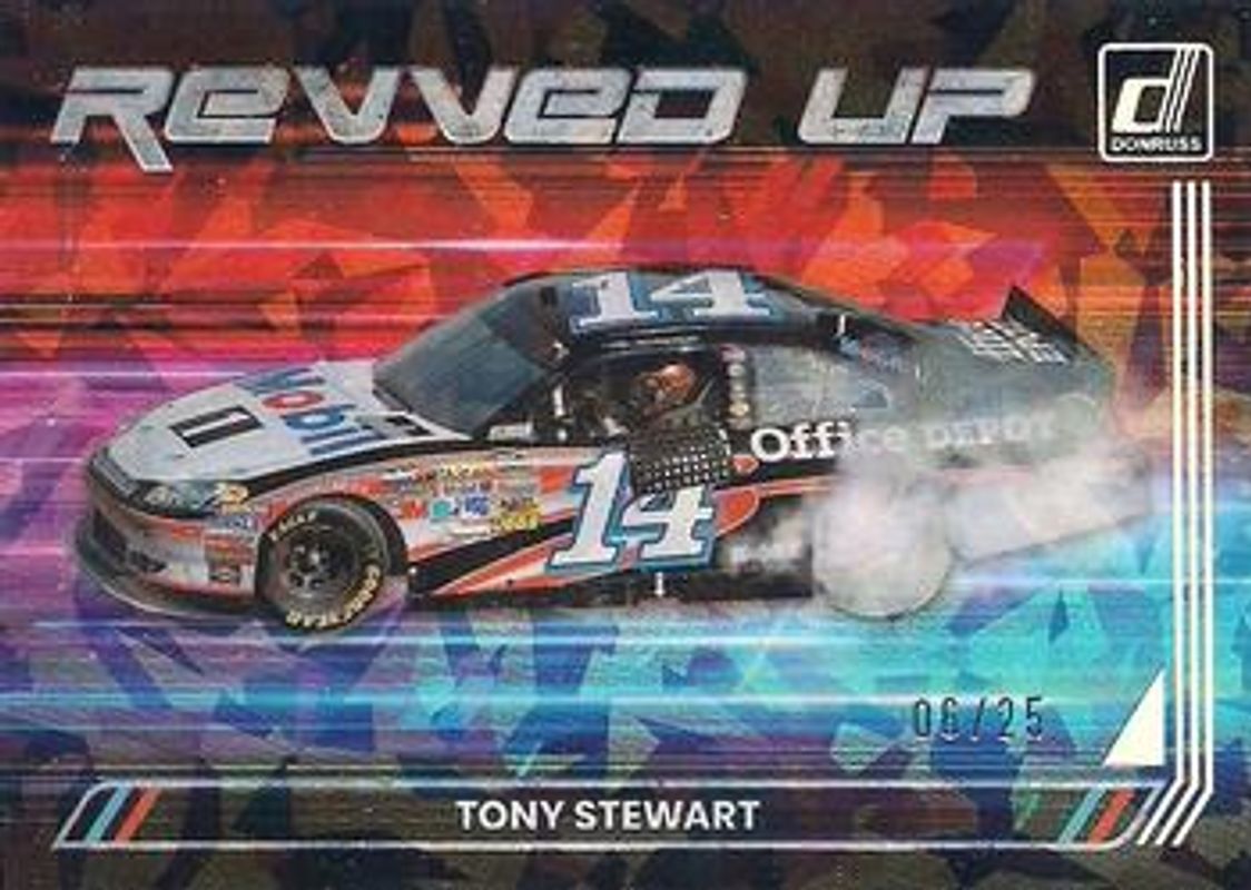 The Tony Stewart 2023 Donruss NASCAR #RU3 Revved Up Cracked Ice /25 card is 1 of 138 Tony Stewart's card variations in the 2023 Donruss NASCAR set being tracked by Sports Card Investor, including #39 Base, #38 Base, #179 Base, #94 Base, and #179 Carolina Blue.